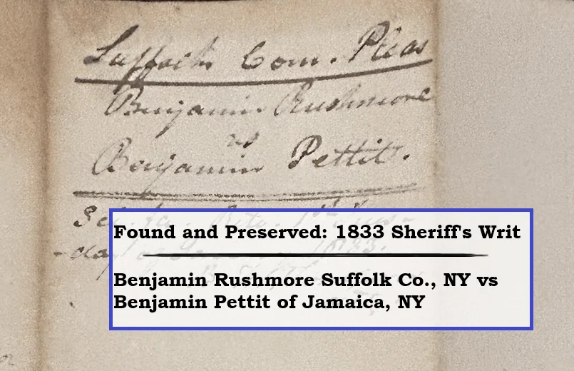 In June of 2025 The Pettit Research Project acquired this 1833 Sheriff's writ from an antique document dealer in New York. The dealer was unsure of the paper's origins but believed she had purchased it about 25 years ago from the estate of Tim Green who was a lawyer in Southhold, NY. The document is a legal writ from the Court of Common Pleas in Suffolk County, NY on behalf of Benjamin Rushmore of Riverhead. Rushmore sued Benjamin Pettit of Jamaica, NY for $206.26 1/2.
