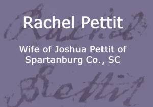 A family record written by Joshua Pettit of Spartanburg Co., SC notes that he was married to a woman named Rachel who was the mother of several children. A family Bible record written by his son Henry Pettit Sr notes basically the same information.