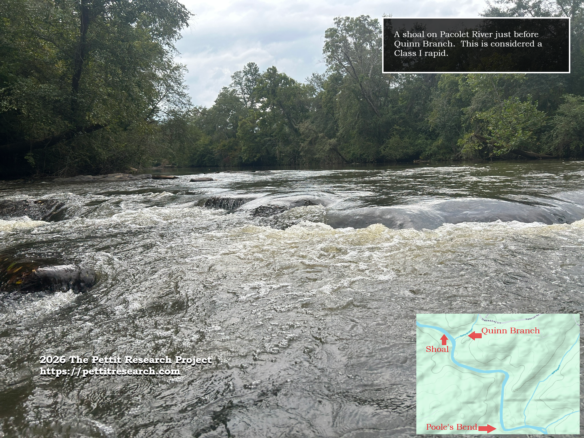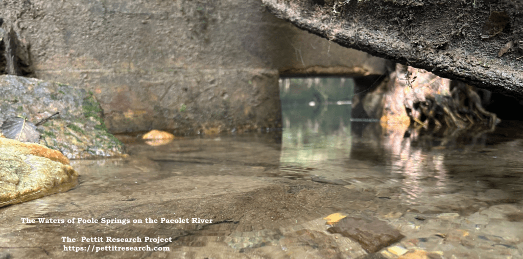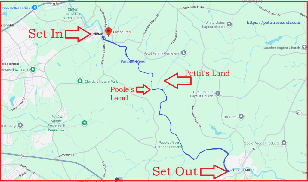 In September of 2025 my youngest son and I made a spur of the moment trip to our ancestral homeland in Spartanburg County, SC.  Our plan was to navigate down the Pacolet River and camp under the stars on the land that once belonged to Henry Pettit and William Poole.  We set out to explore the old Poole Springs (Healing Springs), Pettit Mill Branch, Tumbling Shoals, Lawsons Fork, and various other sites.  We planned to exit the river the next evening at Pacolet Mills.