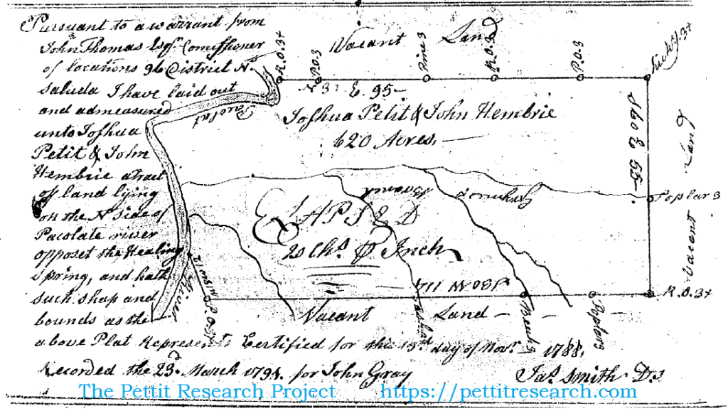 “Grahams Branch” surveyed for Joshua Pettit and John Hembree in 1788. This would later be called “Pettit’s Branch” and eventually “Mill Branch”.
