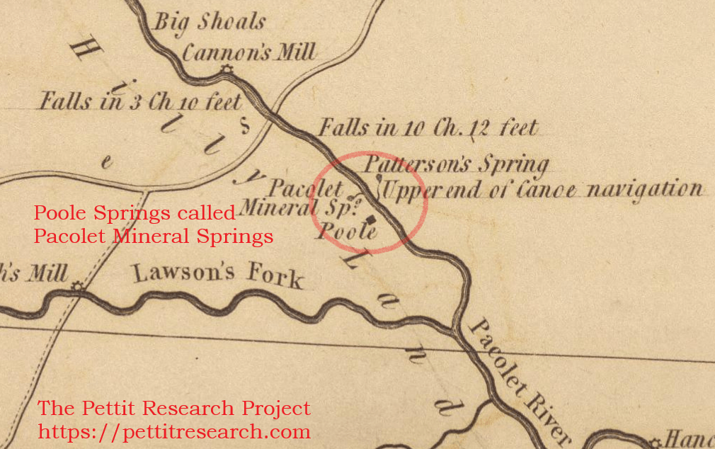 At one time William Poole owned the land from the springs all the way down to Lawsons Fork and beyond.  In his deposition for his Revolutionary War pension application, Henry Pettit stated that the Pettits were living on Lawsons Fork in 1776.  Col William Wofford operated an Iron Works on this creek near present-day Glendale.  Henry’s father Joshua appears to have been associated with Wofford in some way.  He witnessed deeds between Wofford and patriot John Nucklos, served under him in the revolution, and lived nearby, possibly on Wofford’s land.