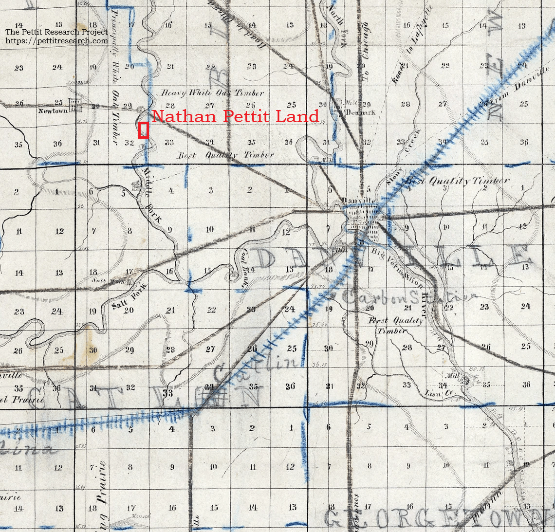 By late spring of 1830, Nathan Pettit and company had pulled up stakes again and pushed about two hundred miles west into Vermilion County, Illinois.[74] Evidently, Thomas Pettit found some reason to remain behind in Milford with his wife and son.  He, his wife Nancy, and son Austin are counted there in the 1830 census.[75]  On May 24, 1830, Nathan Pettit and his wife Levina received a grant of 80 acres of land in Vermilion County, Illinois, in Section 32, Township 20 North, Range 12 West.[76]