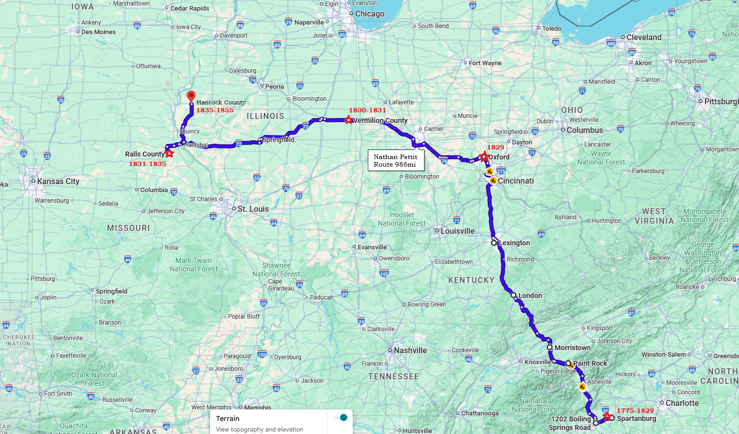 In 1828 the Buncombe Turnpike was completed.[70]  This much needed road connected the Greenville, South Carolina area to the Tennessee/North Carolina line.  Passing through the Saluda Gap in South Carolina and climbing to Asheville, travelers had a safe route that was a significant improvement over the old drover’s path.  At his farm in northwestern Spartanburg County, Nathan Pettit may have encountered many travelers coming from distant points in the north and west.  Places like Lexington, Kentucky and Cincinnati, Ohio could now be reached by wagon for Nathan. At least one member of the nearby Brashears family had already relocated to Ralls County, Missouri, by 1827.[71] There may have been others who migrated from the Motlows Creek neighborhood who returned with encouraging stories of the fertile lands in the west.