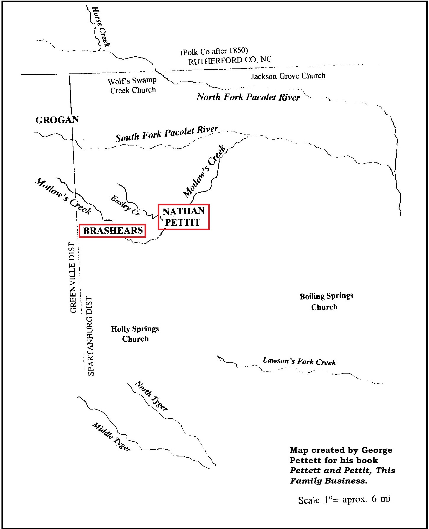 In 1805 a man who factored heavily into Nathan’s early life, William Brashears, obtained a grant for 966 acres in northwest Spartanburg County, near the Greenville County line.[37]  The land was situated around Motlows Creek.  William Brashears established his home there and set up a mill which was powered by the waters of the creek. By March of 1808, Nathan Pettit had relocated to the Motlows Creek area.  He is mentioned that year as a neighbor in the deed of sale of fifty acres in the area from George Campbell to Samuel Fowler.[38]  On September 25, of the same year Nathan Pettit along with William Brashears witnessed a deed between George Alexander and John Owens for land on both sides of Motlows Creek.[39]